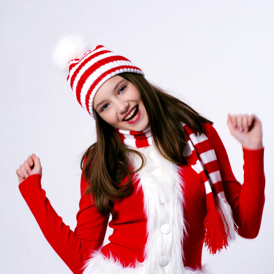 Christmas, Santa costume, Santa hat, Santa scarf, White, arms raised, brown hair, dancing, female, happy, holiday, isolated background, long hair, pom pom hat, red outfit, red white hat, scarf, smiling, striped hat, white fur trim, winter fashion, young girl, girl