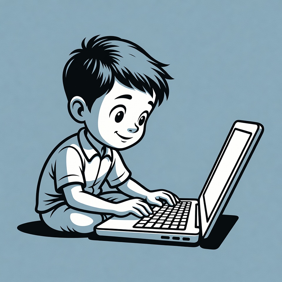 A cartoon boy with short black hair sits cross-legged on the floor, typing on an open white laptop. He wears a short-sleeved collared shirt and smiles happily with large expressive eyes. The illustration features bold black lines on a light blue background.