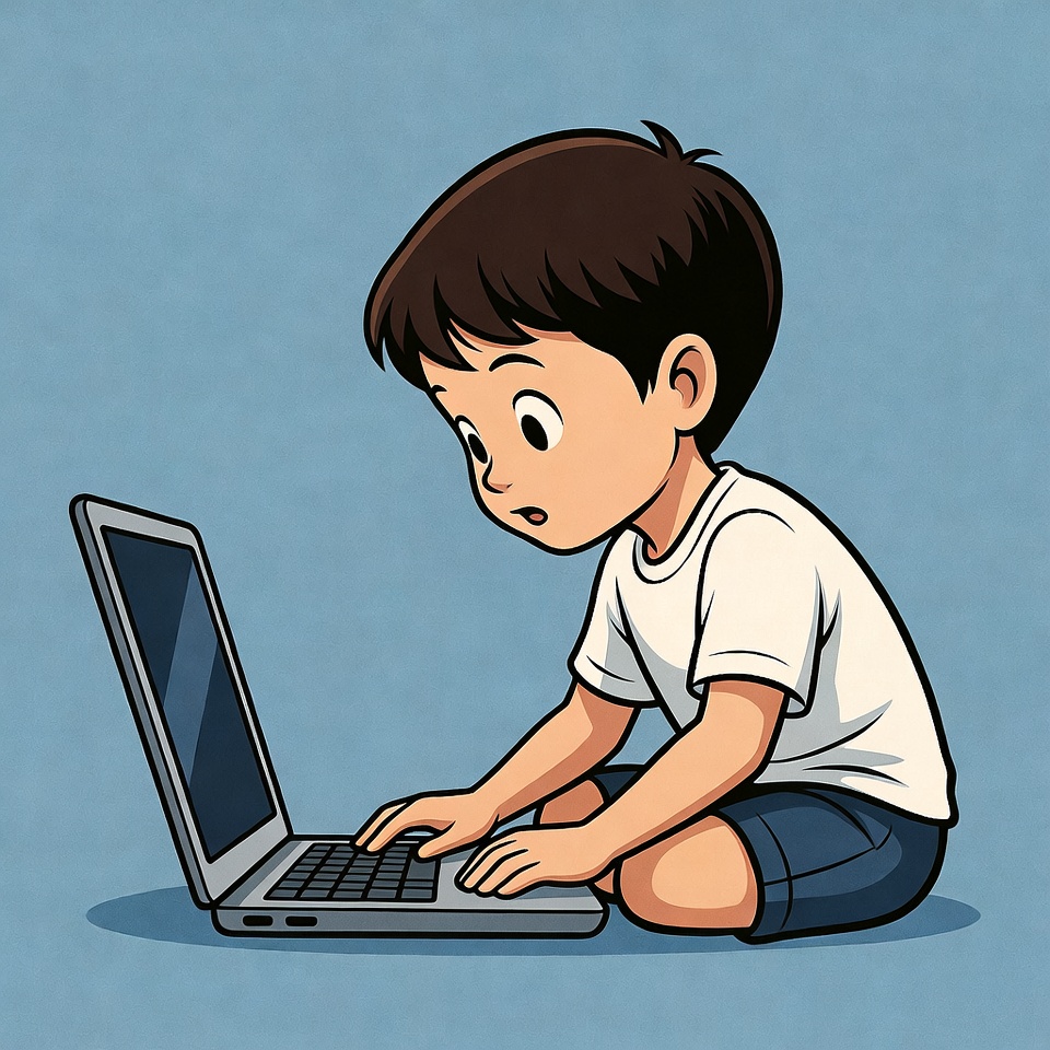 A cartoon boy with short black hair sits on the floor using a silver laptop. He wears a white t-shirt and blue shorts, with wide surprised eyes focused on the screen. The illustration features a solid blue background.