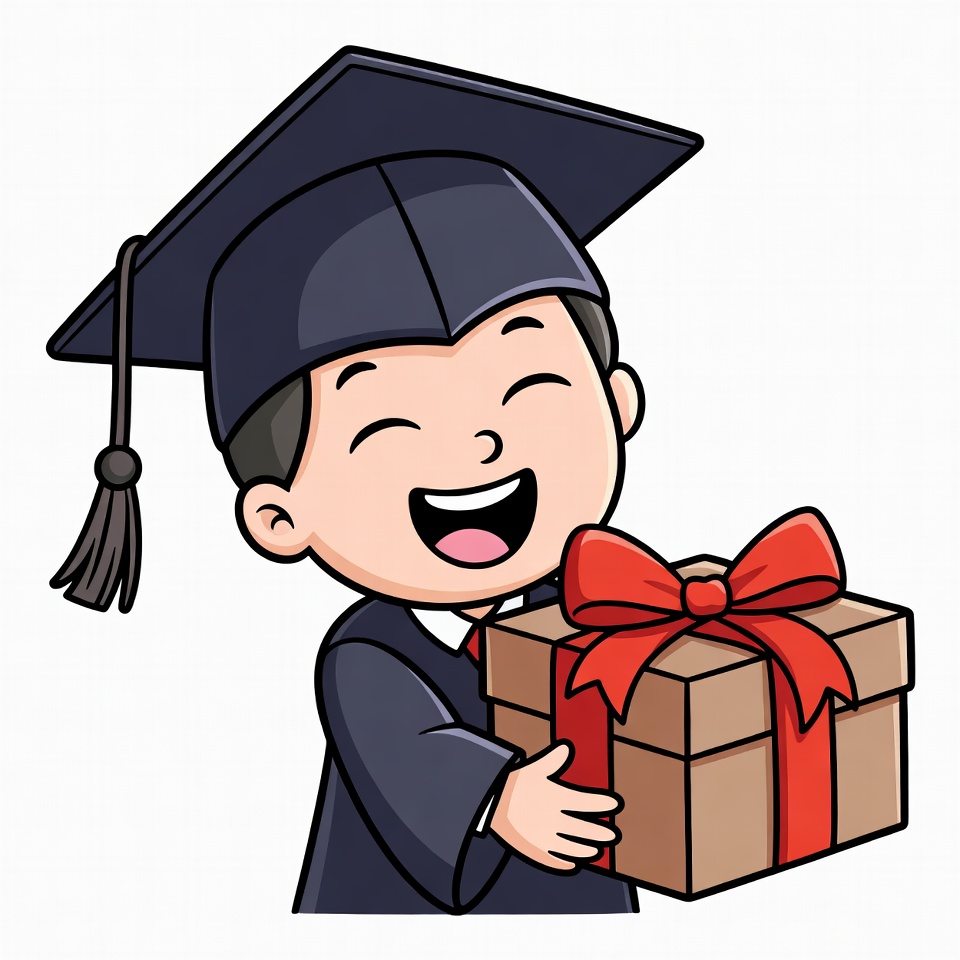 A cartoon Asian boy wearing a black graduation cap and gown smiles happily while holding a brown gift box with a red ribbon. He stands on a white background with his eyes closed in joy. The illustration features vibrant colors and a cute, expressive face.