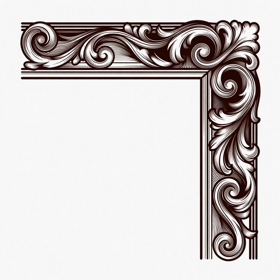 Victorian frame, baroque ornament, clipart, decorative frame, elegant border, engraving, flourishes, foliage design, frame corner, graphic design, illustration, isolated background, line art, ornate border, rococo style, scrollwork, swirl pattern, vector art, vintage design, corner frame