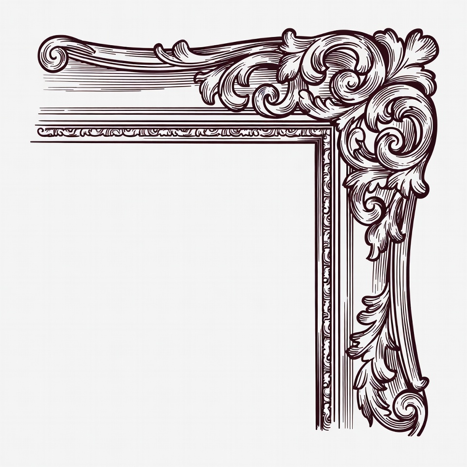 Victorian frame, baroque style, clipart, corner frame, decorative border, empty frame, filigree, flourish, foliage, graphic element, illustration, isolated background, line art, picture frame, scrollwork, vector art, vintage design, ornate frame