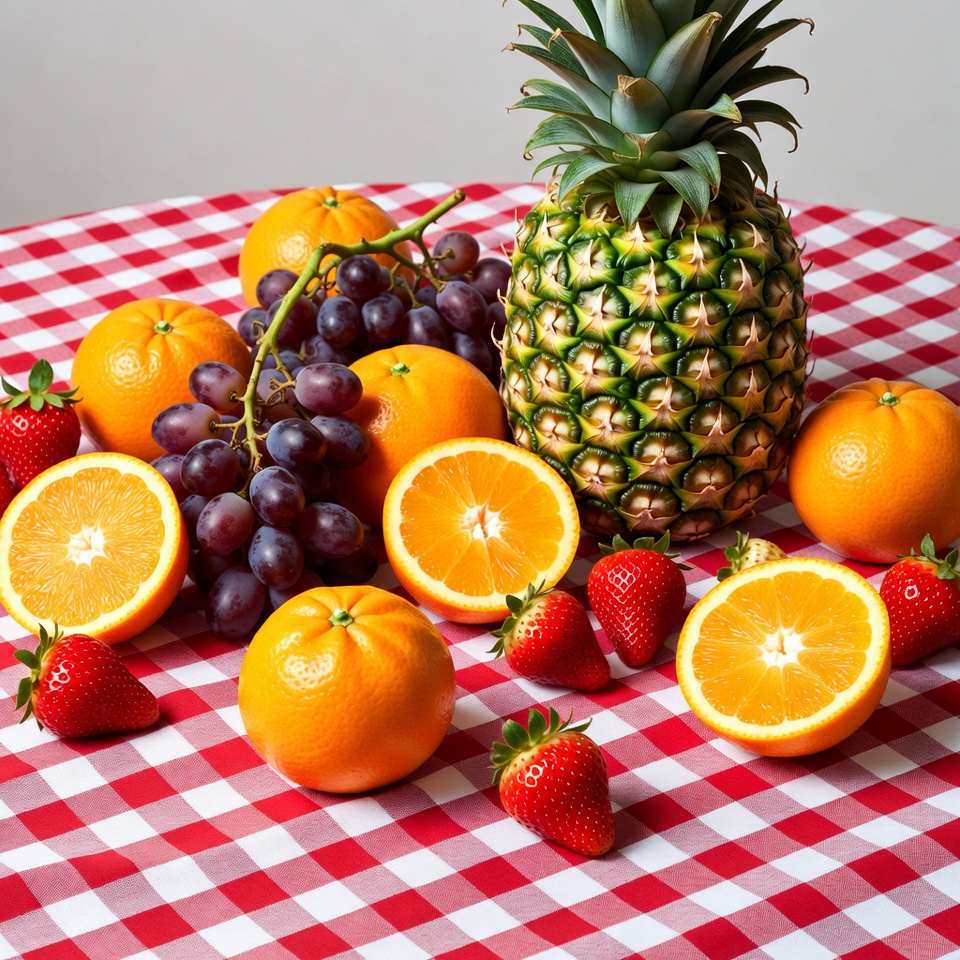 A vibrant still life features a large pineapple surrounded by sliced and whole oranges, clusters of purple grapes, and fresh strawberries on a red checkered tablecloth. Oranges are halved to reveal juicy segments, and grapes hang in bunches. The white background highlights the colorful fruits arranged neatly.