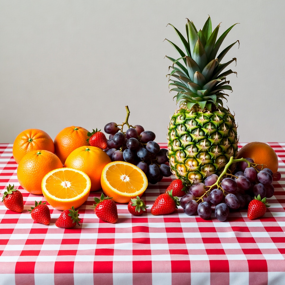 A vibrant assortment of fresh fruits is arranged on a red and white checkered tablecloth. The display features a tall pineapple in the center, surrounded by whole and halved oranges, clusters of red strawberries, and bunches of purple grapes. All fruits are brightly colored and placed against a plain white background.