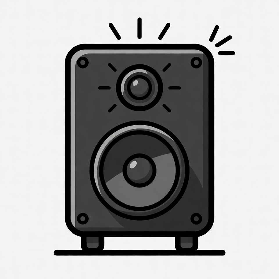 A black rectangular speaker icon features a large woofer and small tweeter in the center. Bright yellow sound waves radiate from the top right corner. The illustration is outlined in black on a white isolated background.