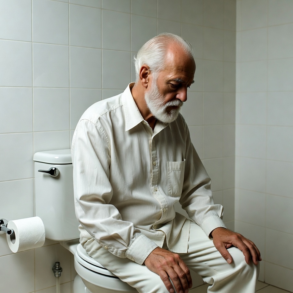 An elderly man with white hair and a beard sits on a white toilet in a tiled bathroom. He wears a white shirt and pants, with his hands resting on his knees and head slightly bowed. The bathroom features white porcelain tiles and a simple flush handle.