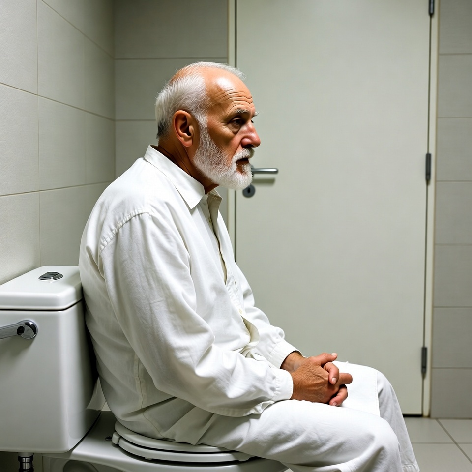 An elderly man with white hair and beard sits on a white toilet in a tiled bathroom. He wears a white shirt and pants, with hands clasped in his lap, looking sideways. The bathroom features light gray tiles and a closed door.