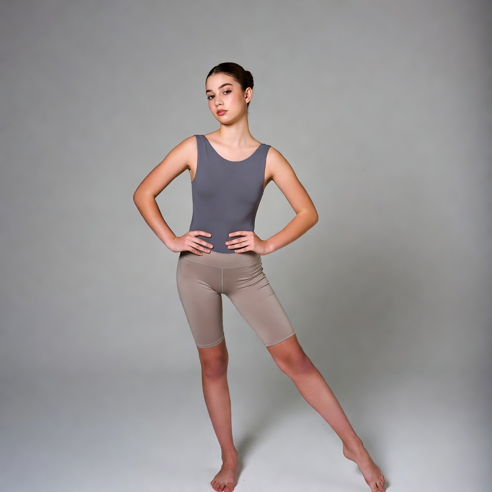 A teenage girl with dark hair in a bun stands confidently on a gray background. She wears a gray tank leotard and matching shorts, with hands on hips and one leg extended. Her bare feet are visible, emphasizing her poised dancer stance.
