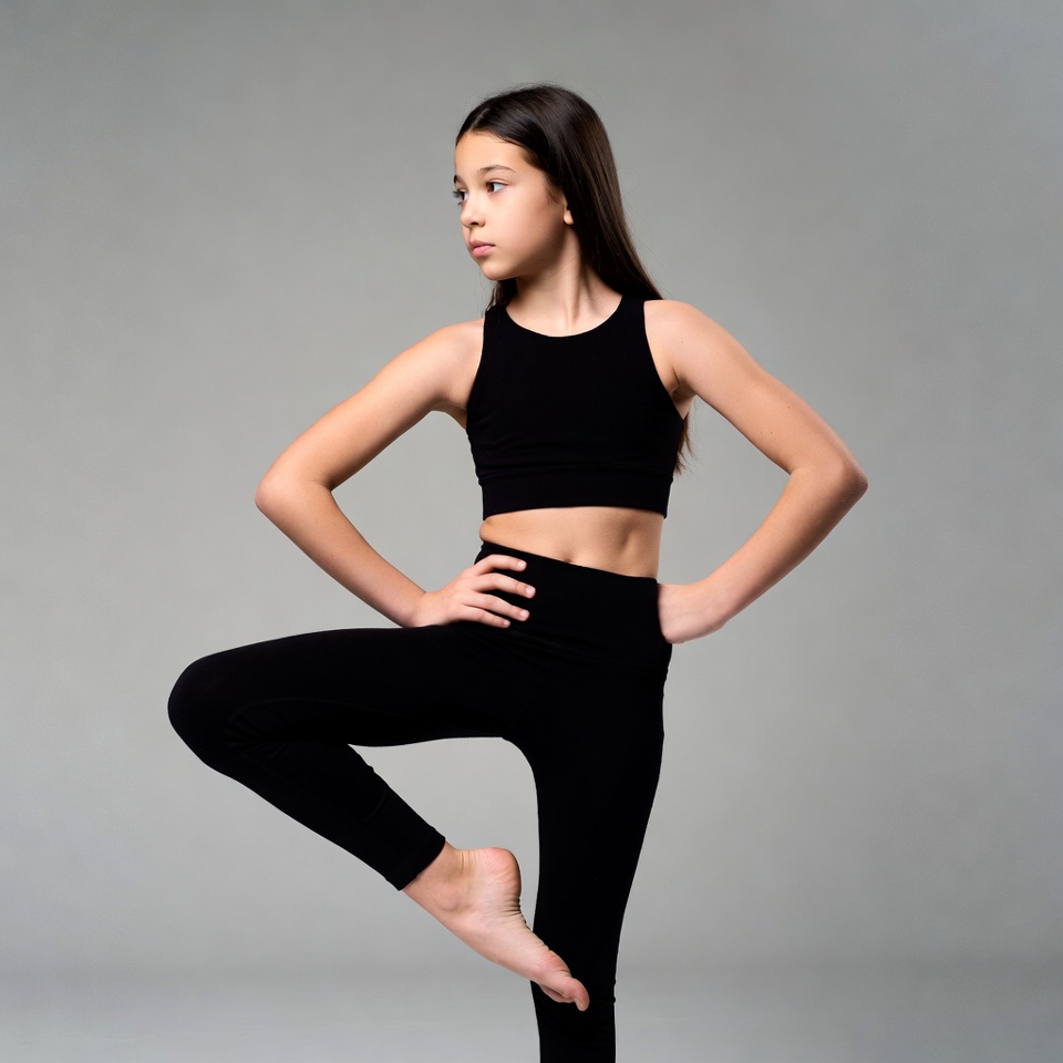 Asian, activewear, balancing, black leggings, black tank top, child yoga, dancer pose, dark hair, exercise, female, fitness, flexible girl, gray background, hands on hips, kid stretching, long hair, one leg raised, sportswear, studio photo, yoga pose, young girl, girl