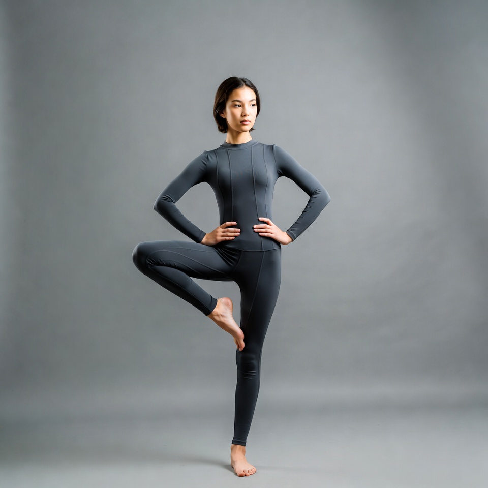 Asian, athletic woman, balance, balancing pose, bare feet, black hair, bun hairstyle, dancer pose, exercise, fitness wear, flexibility, gray background, gray outfit, hands on hips, long sleeve unitard, one leg raised, pose, sportswear, studio background, thigh placement, tree pose, vrksasana, yoga, young woman, woman
