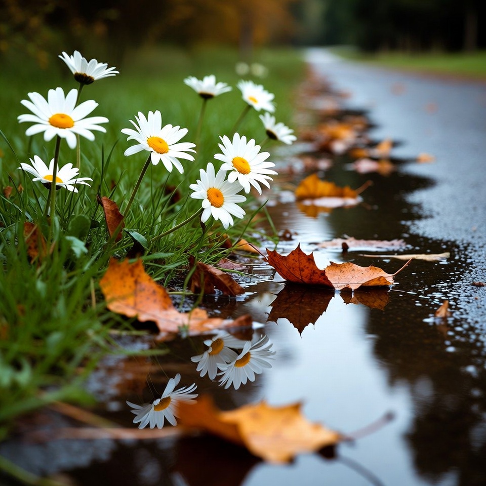 White daisy flowers grow along the edge of a wet, reflective road lined with fallen orange autumn leaves. The road surface shows clear reflections of the daisies and leaves after rain. Lush green grass and blurred fall foliage frame the scene in the background.