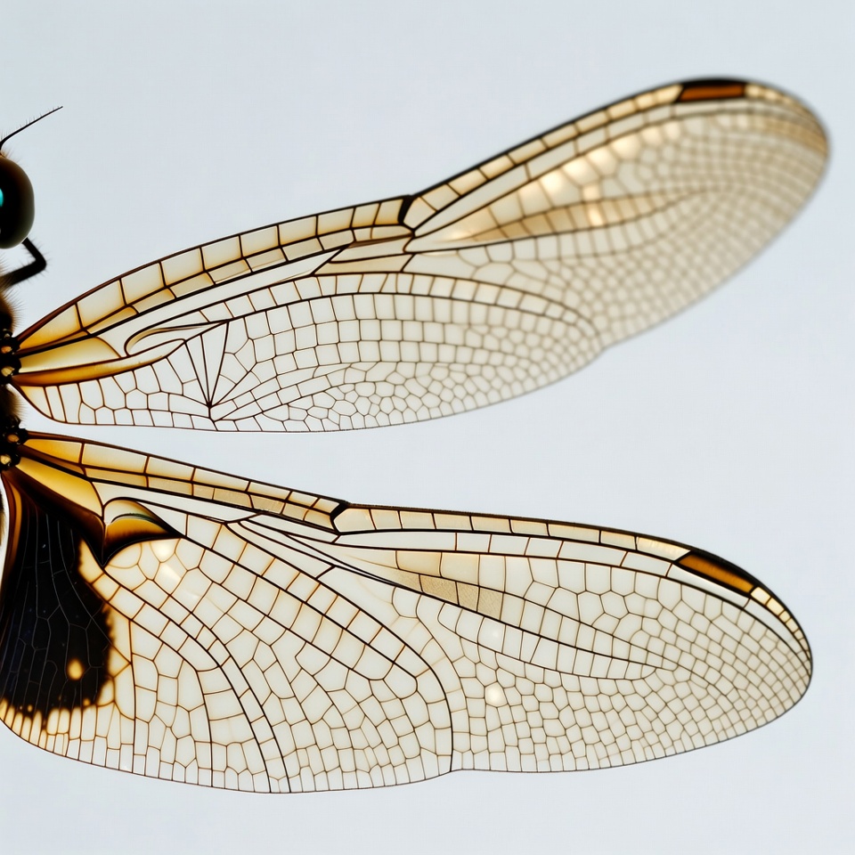 A dragonfly with transparent wings featuring intricate vein patterns is captured in closeup against a white background. The wings display subtle amber and brown hues along the edges. The body is dark with yellow markings near the wings.