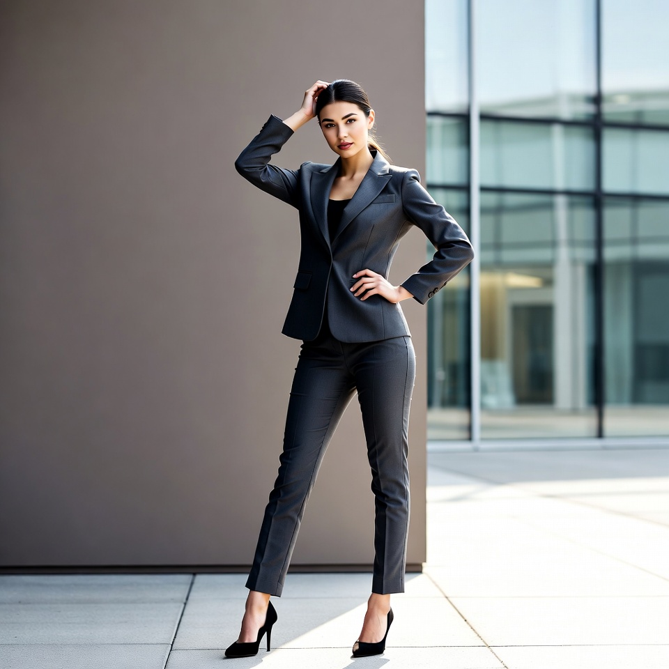 A young Middle Eastern woman with dark hair in a ponytail stands thoughtfully with hand on head and other on hip. She wears a fitted black blazer, pants, and high heels. She poses confidently in front of a modern glass building on a paved outdoor area.
