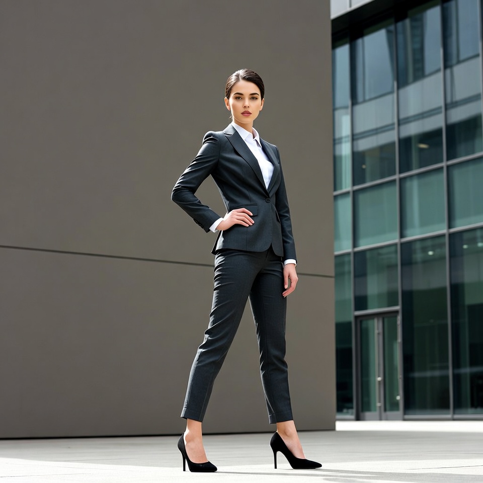 A young Asian woman stands confidently with hands on hips in front of a modern glass building. She wears a tailored gray suit, white shirt, and black high heels. Her dark hair is neatly styled, and she poses on a concrete surface under daylight.