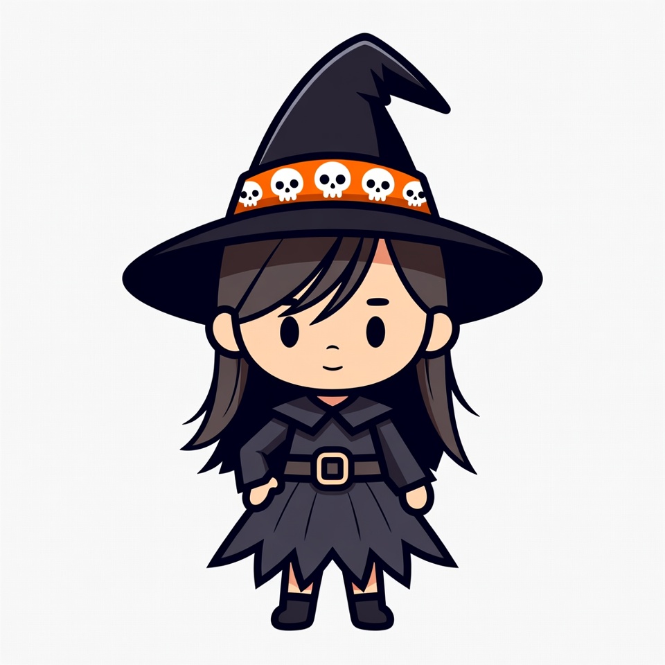 A chibi-style cartoon girl with long dark hair wears a black pointed witch hat decorated with orange skulls. She has a black dress with a belt and jagged edges, standing on an isolated white background. Her large eyes and smiling expression give her a cute, playful appearance.