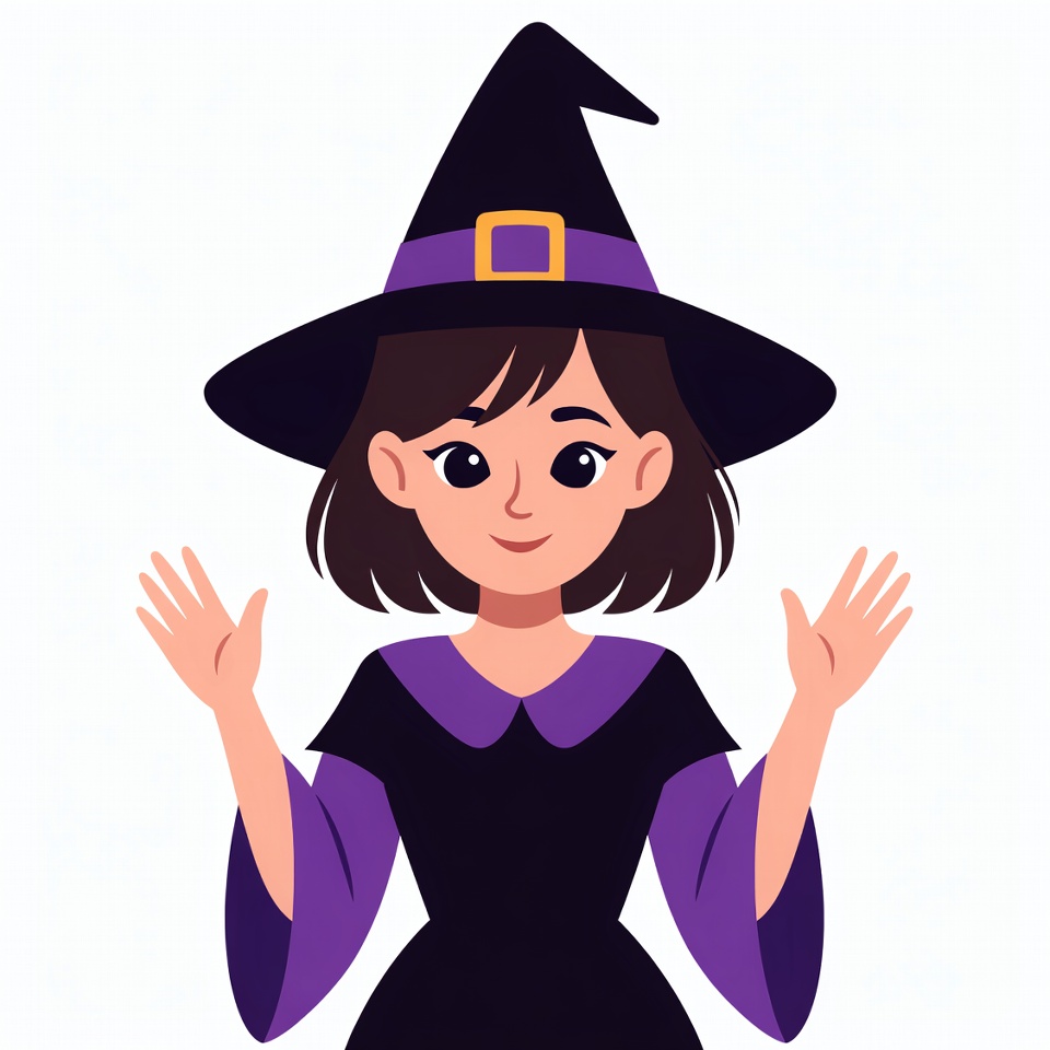 A cartoon illustration of a young witch girl with short brown hair and large eyes wears a black dress with purple sleeves and collar. She has a tall black witch hat with a gold buckle and stands with both hands raised open on an isolated white background. Her expression is cheerful and friendly.