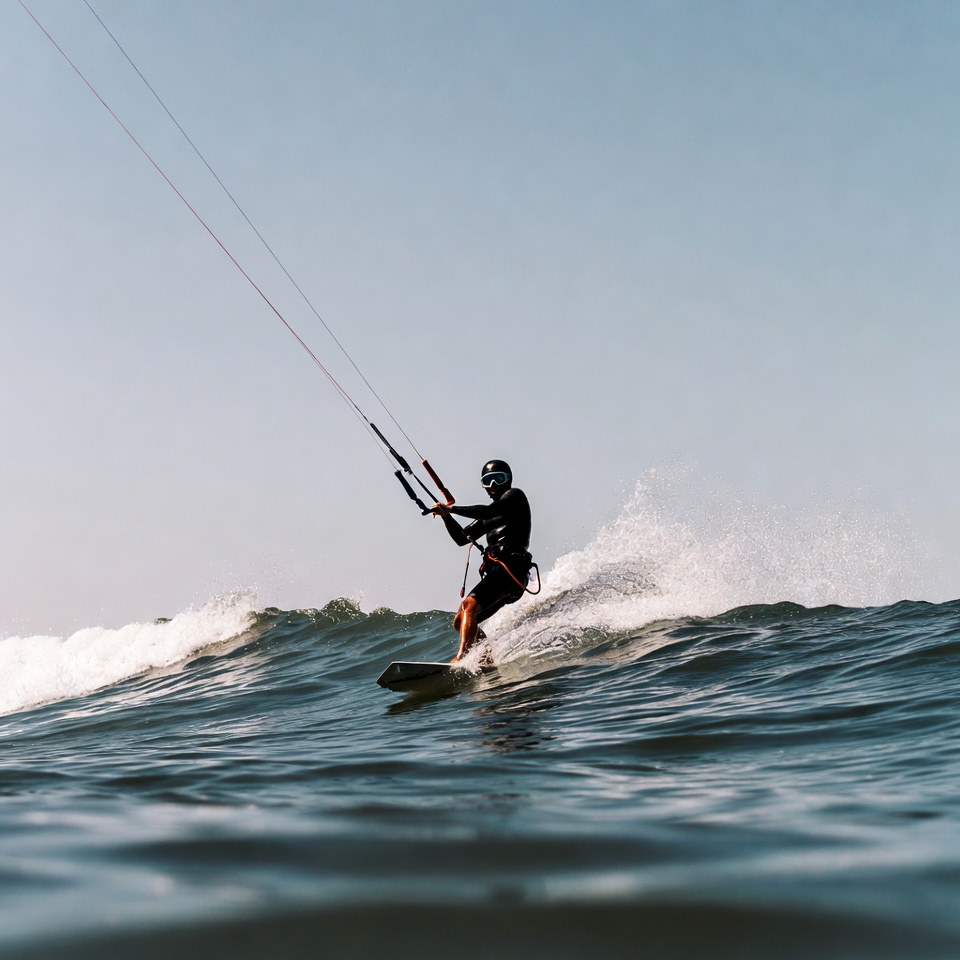 action, adventure, athletic, blue sky, board, dynamic, extreme sports, helmet, kiteboard, kitesurfer, male, man, ocean, outdoors, sea, splash, sport, surfing, water, water sports, waves, wetsuit, wind sport, kitesurfing