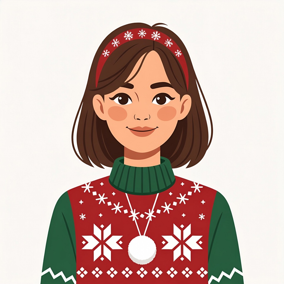A young woman with shoulder-length brown hair wears a festive red and green sweater adorned with white snowflake patterns. She has a red headband with green accents and a large white pendant necklace. The illustration features her smiling face on an isolated white background.