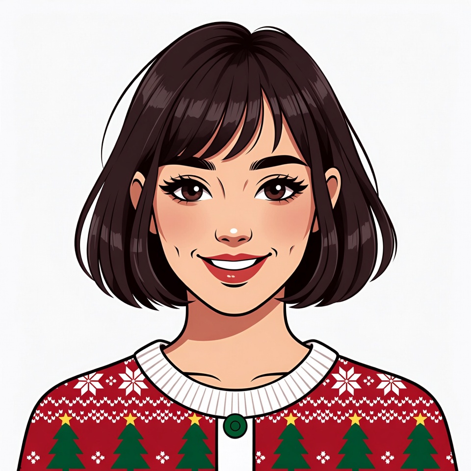 A young Asian woman with shoulder-length dark brown hair and glossy lips smiles happily at the viewer. She wears a vibrant red Christmas sweater featuring white snowflakes and green Christmas trees with a decorative button. The illustration is set against a plain white background.