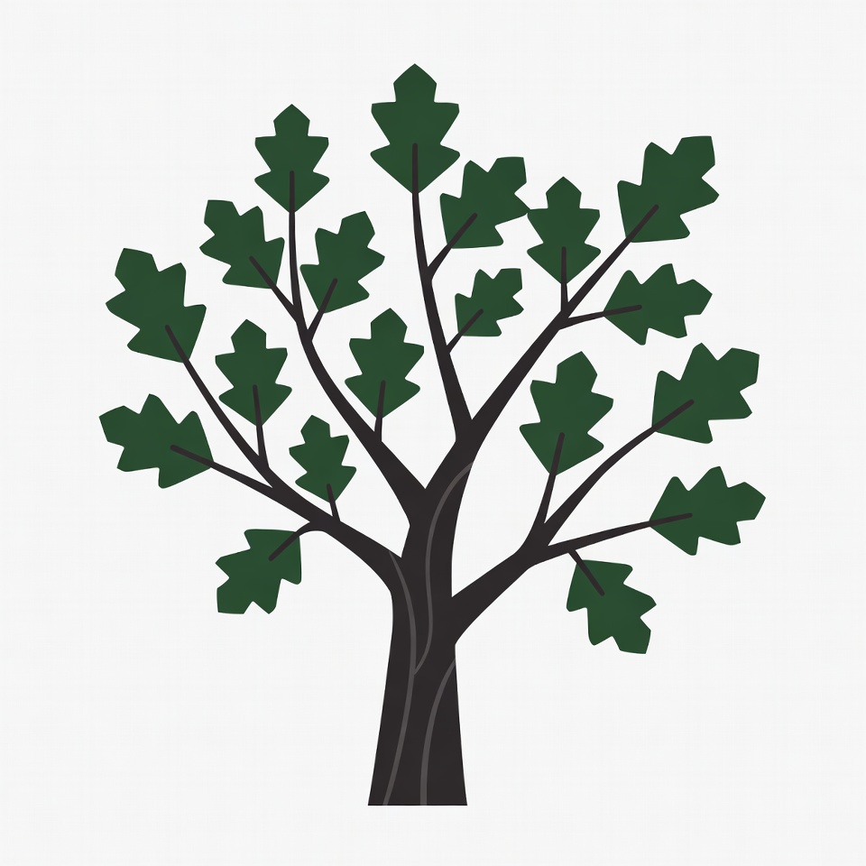 A simple vector illustration of a tall oak tree with dark green leaves and a thick brown trunk. The leaves are angular and numerous, branching out from sturdy limbs. It stands isolated on a white background.