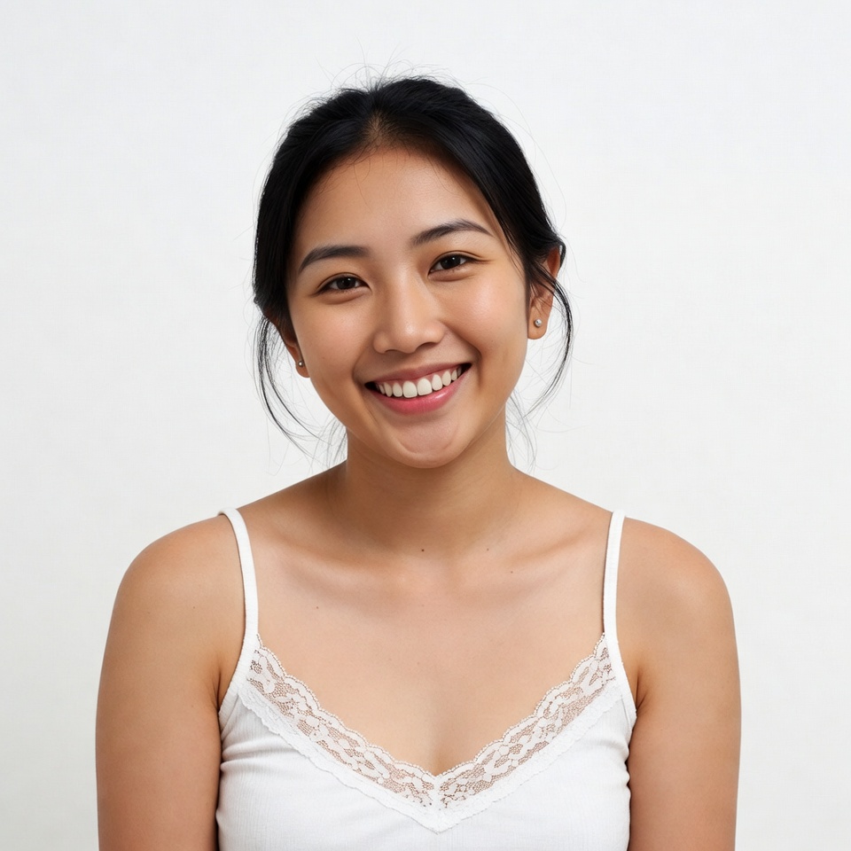 A young Asian woman with long black hair tied back smiles warmly at the camera. She wears a white lace camisole with thin straps and stands against a plain white background. Her expression is joyful with bright eyes and visible teeth.