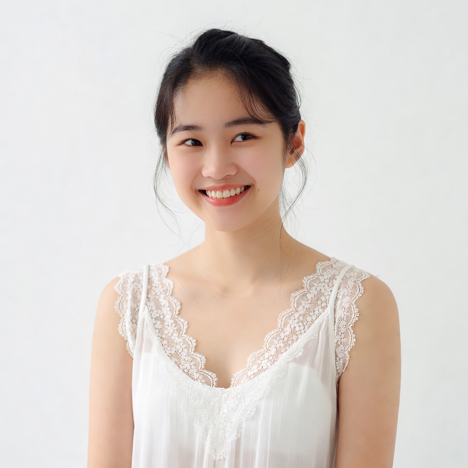 A young Asian woman with dark hair tied in a neat bun smiles warmly at the camera. She wears a delicate white lace camisole top with intricate detailing on a plain white background. Her expression is cheerful and approachable.
