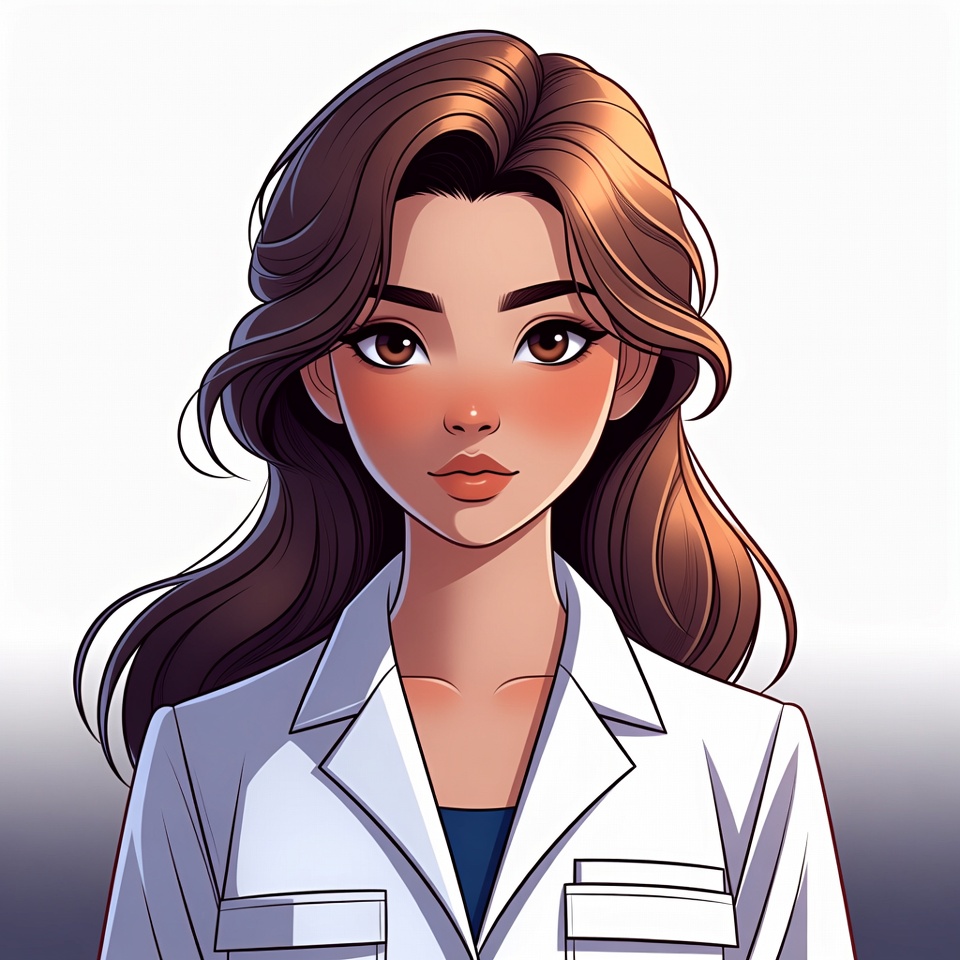 A young woman with long wavy brown hair and large expressive eyes faces forward in a detailed digital illustration. She wears a white lab coat over a blue top and has a subtle blush on her cheeks. The image features a clean white background with soft shading.