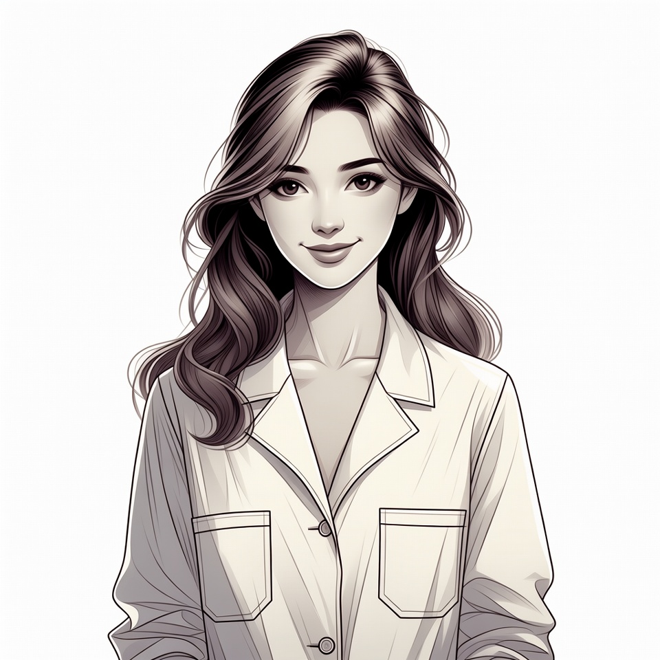 Asian, brown hair, buttons, collared jacket, digital art, doctor coat, female, illustration, isolated background, lab coat, line art, long hair, pockets, portrait, smiling woman, wavy hair, white coat, young woman, woman