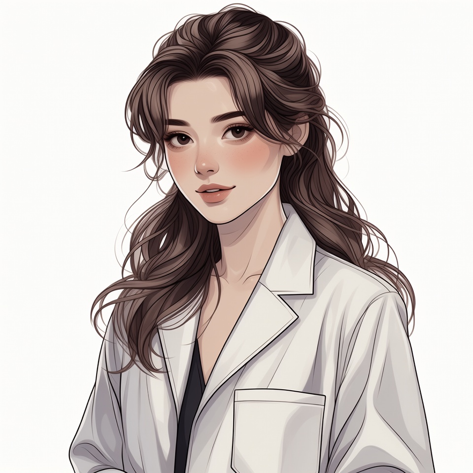 A young Asian woman with long wavy brown hair stands smiling against a white background. She wears a white lab coat over a black top, with subtle blush on her cheeks and glossy lips. The digital illustration features soft shading and detailed facial features.