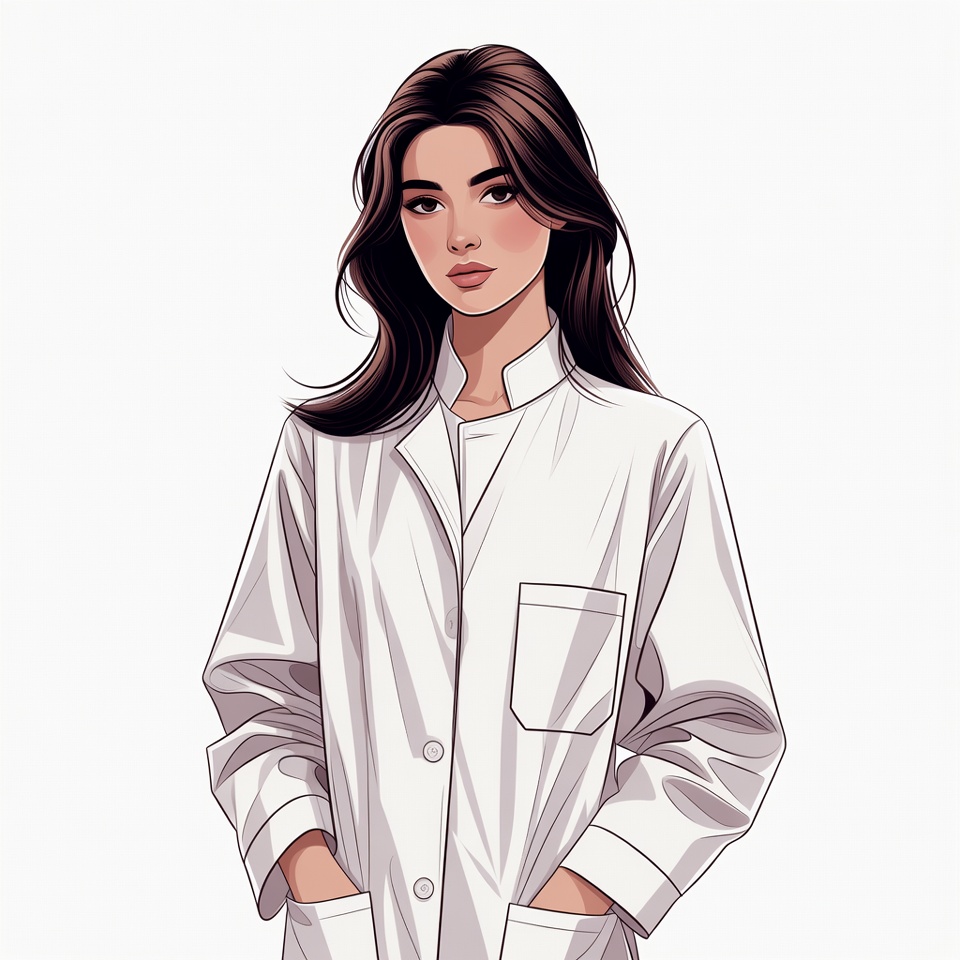 An illustrated Asian woman with long brown hair stands confidently wearing a white lab coat with hands in pockets. She has a subtle smile and smooth features on an isolated white background. The digital artwork features clean lines and soft shading.