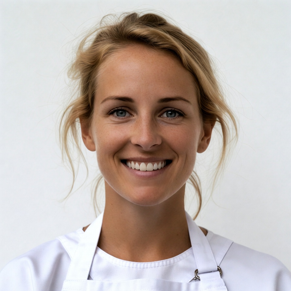 White, blonde hair, blue eyes, chef apron, fair skin, female, friendly smile, happy face, headshot, isolated background, loose hair, portrait, smiling woman, white apron, white background, young woman, woman