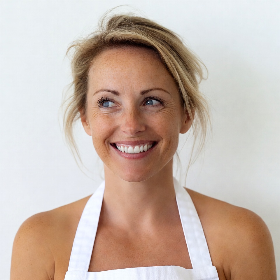 A woman with tousled blonde hair and fair skin smiles warmly at the camera. She wears a white strapless apron over her bare shoulders against a plain white background. Her eyes are crinkled in a genuine smile showing white teeth.