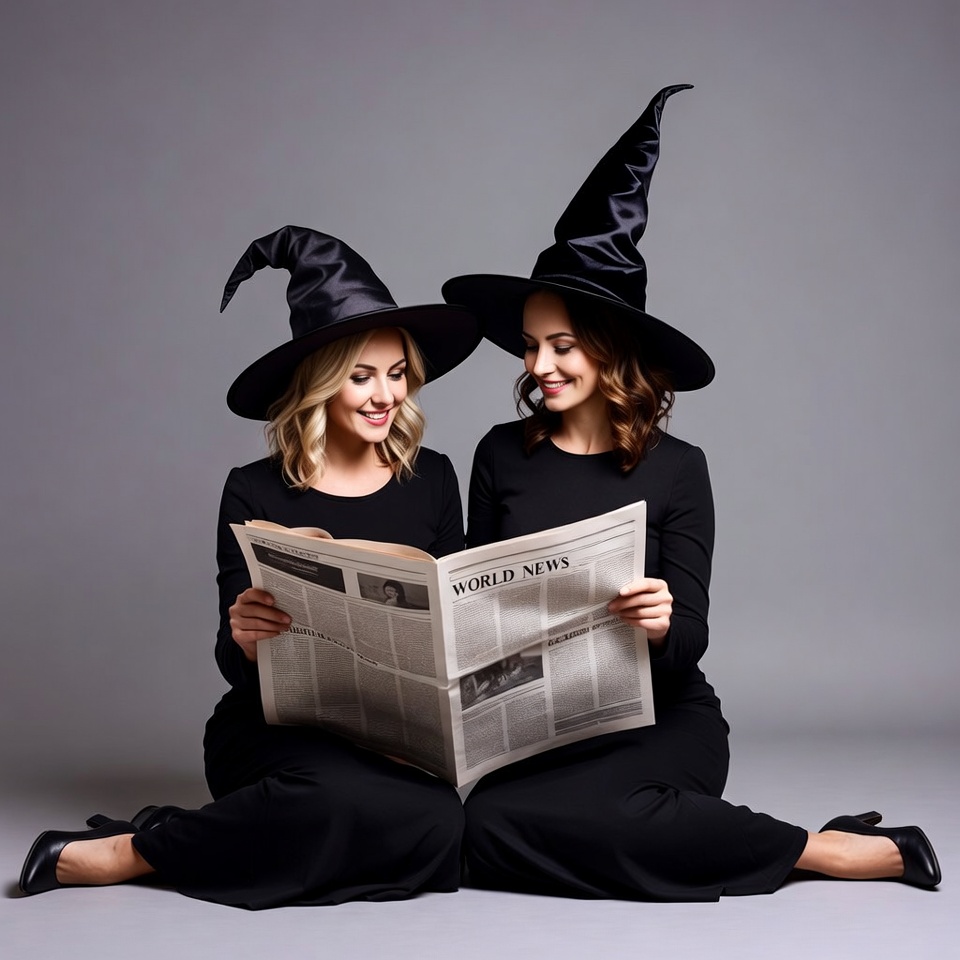 Halloween, White, World News, black dresses, blonde hair, curly hair, female, gray background, newspaper, reading newspaper, sitting, smiling, witch hats, women, witches