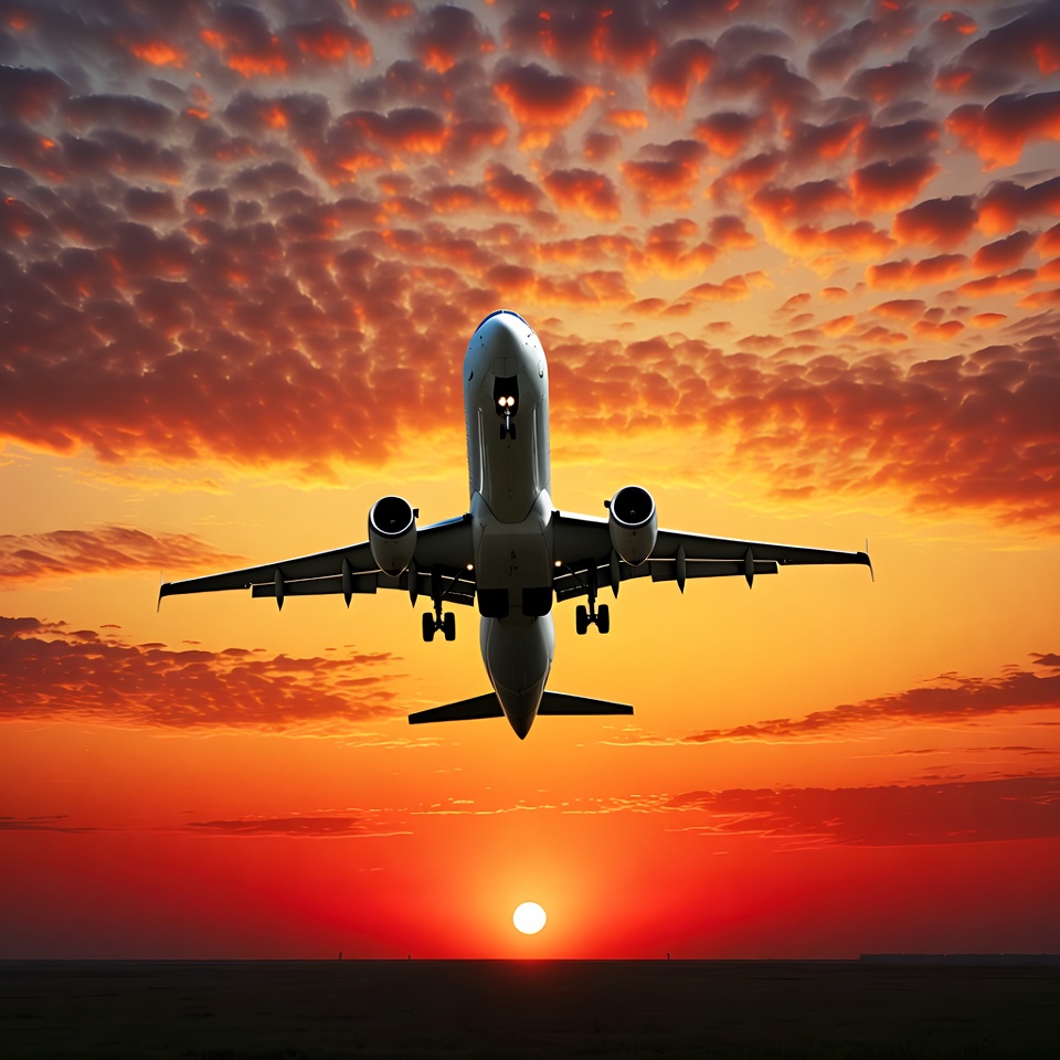 Airplane Flying into Sunset Sky