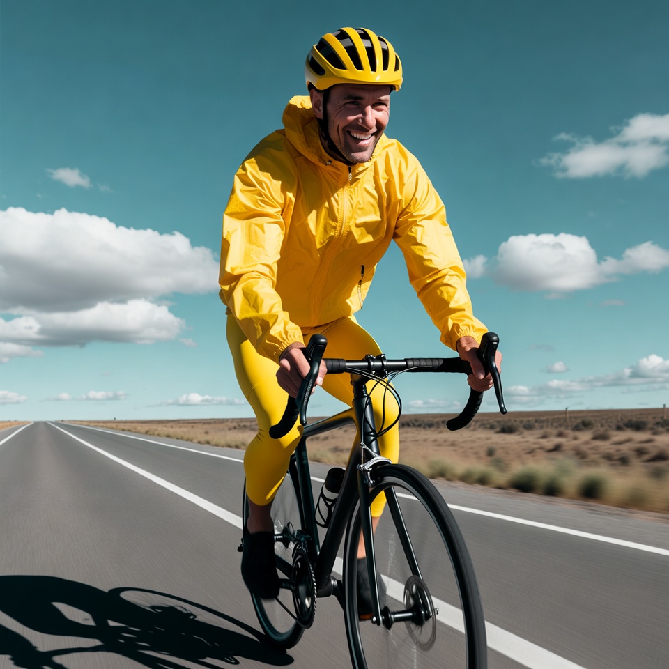 A man with a smiling face wears a bright yellow helmet, rain jacket, and pants while riding a black road bike on a straight highway. He grips the handlebars firmly as he cycles outdoors under a partly cloudy blue sky with desert landscape on both sides. His black cycling shoes are visible on the pedals.