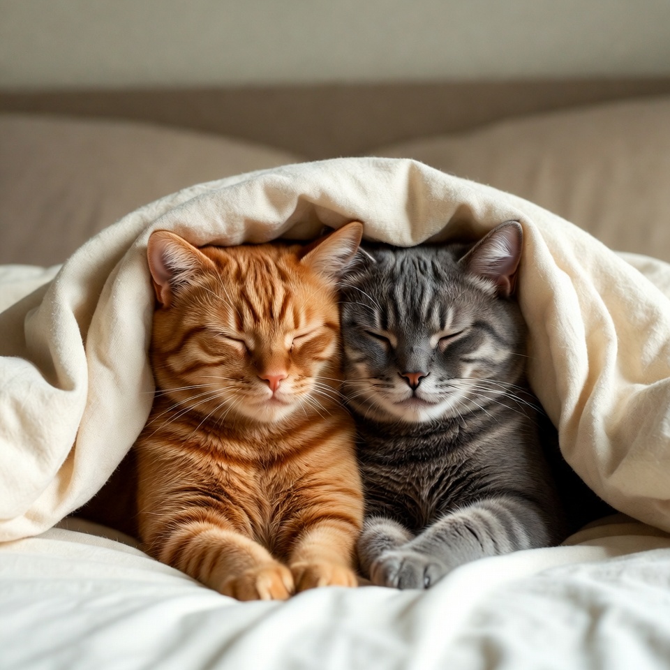 An orange tabby cat and a gray tabby cat lie snugly together under a white blanket on a bed. Both cats have their eyes closed and appear relaxed, with their paws tucked in. The soft bedding and neutral background highlight the cats' fur patterns and peaceful pose.