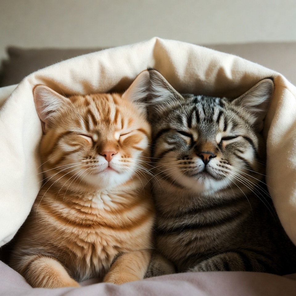 Two Cats Snuggling Under Blanket