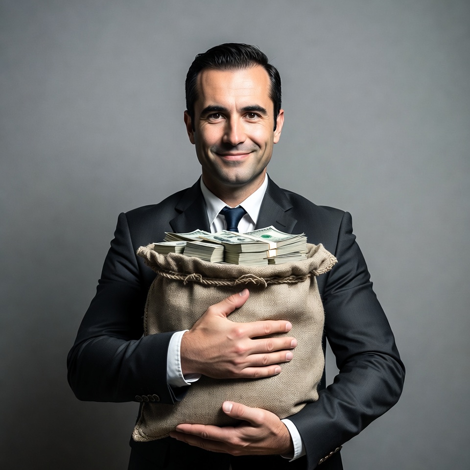 A smiling man with dark hair and neat beard stands confidently against a gray background. He wears a black suit, white shirt, and tie while holding a large burlap sack overflowing with stacks of U.S. dollar bills. His hands grip the sack firmly in front of his chest.