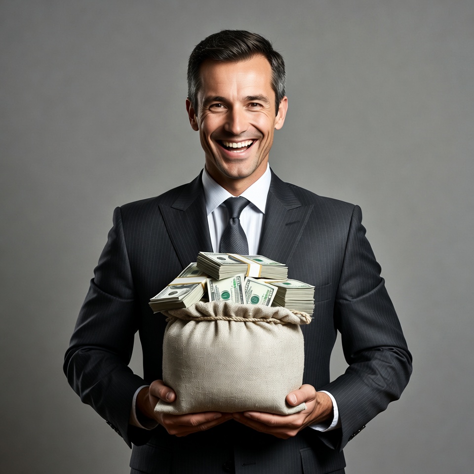 A smiling middle-aged White man in a dark suit and tie holds a large burlap sack overflowing with U.S. dollar bills. He stands confidently against a plain gray background. His expression shows joy and success as he grips the heavy money bag with both hands.