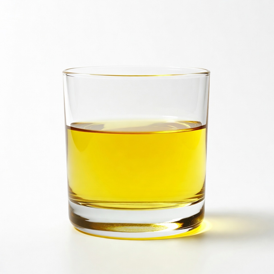 A clear glass tumbler contains a bright yellow liquid, filled about halfway. The liquid has a smooth surface with subtle highlights from the light. It is isolated against a plain white background.