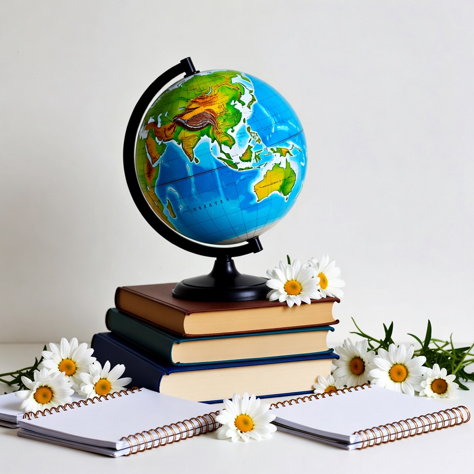 A green and blue globe sits atop a stack of colorful hardcover books on a white surface. White daisies and green stems adorn the books and surrounding area. Open spiral notebooks with blank pages are placed nearby.