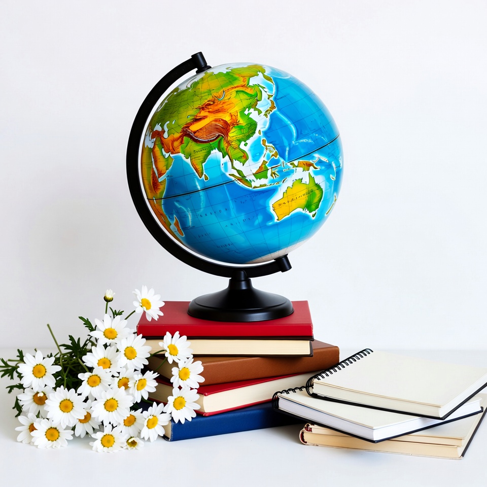 A colorful globe sits atop a stack of assorted books including red, brown, and blue volumes on a white surface. White daisies with green stems are arranged around the base of the black globe stand. A white notebook lies nearby among the books.