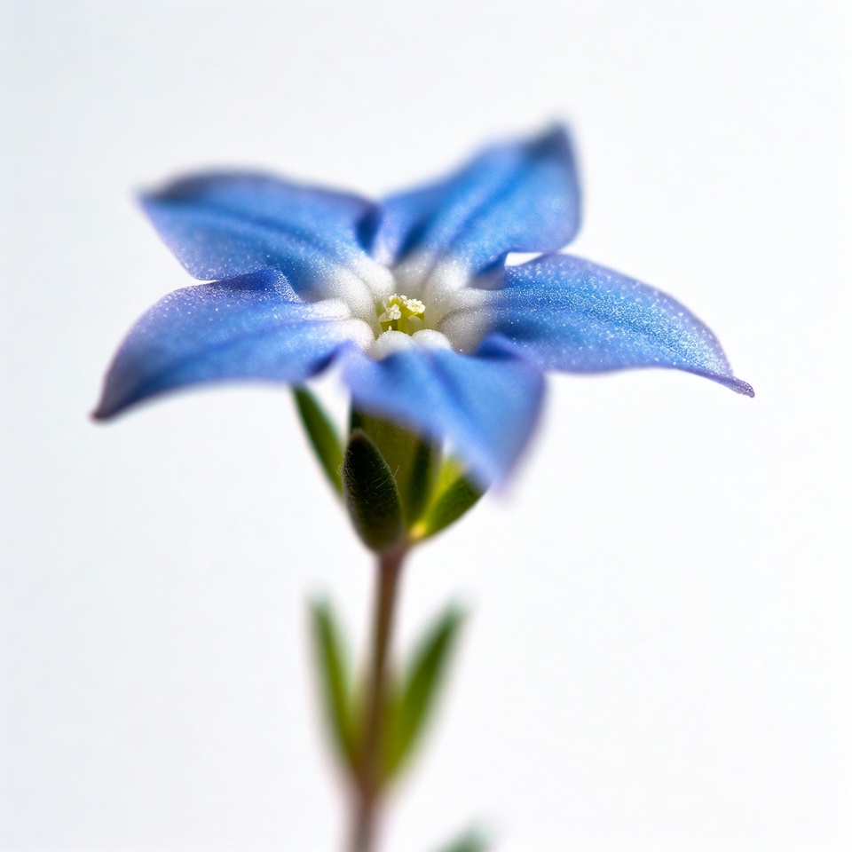 blue petals, botany, closeup, five petals, floral, flower, green stem, isolated background, macro, nature, plant, vibrant blue, white background, white center, blue flower