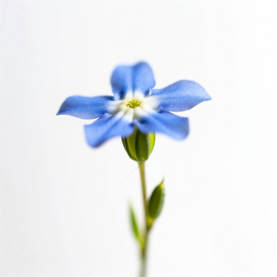 bloom, blue flower, blue petals, botany, closeup, delicate, floral, flower, green stem, isolated, macro, nature, petals, sepals, white background, yellow center, forget-me-not