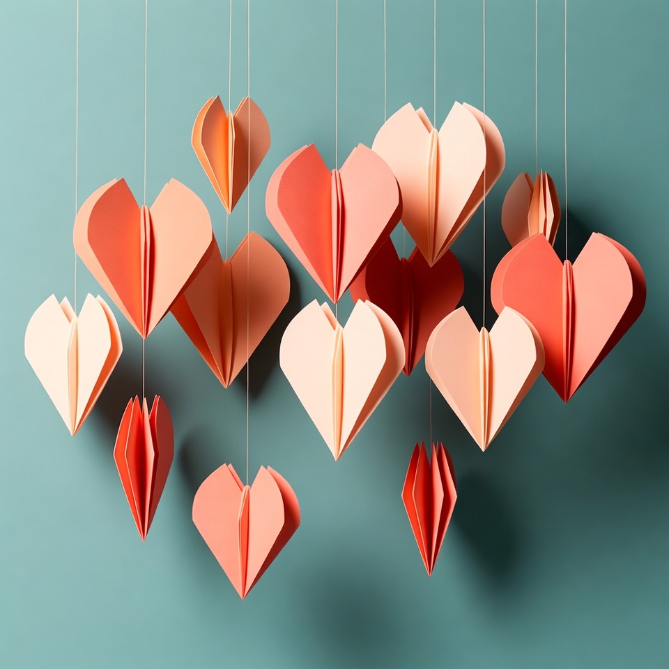 Hanging Origami Hearts on Teal Background