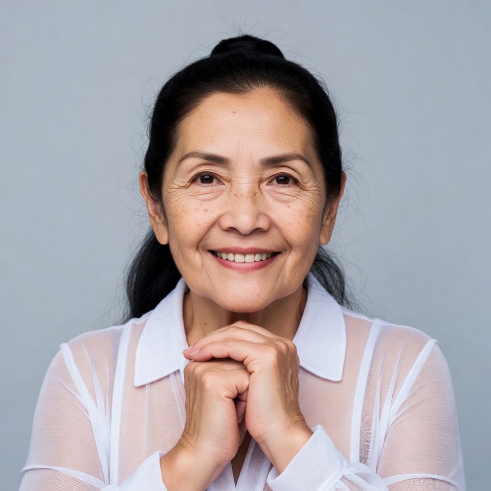 collared shirt, dark hair, female, gray background, hands clasped, happy face, isolated background, mature woman, ponytail, portrait, prayer gesture, praying hands, sheer blouse, smiling, white blouse, woman, Asian woman