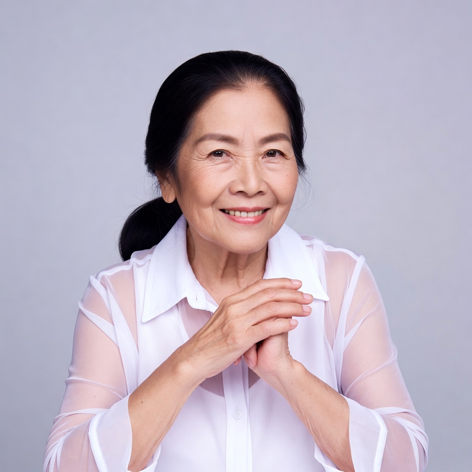 An elderly Asian woman with black hair in a ponytail smiles warmly at the camera. She wears a sheer white collared blouse with long sleeves and holds her hands clasped together in front. She stands against a plain gray background.
