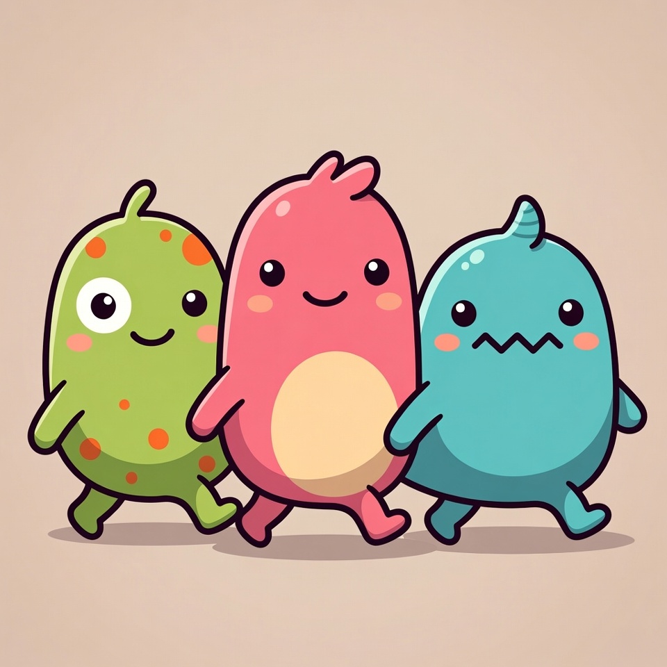 Three adorable cartoon dinosaurs in green, pink, and blue colors walk together on a beige background. The green dinosaur has spots and a big smile, the pink one features rosy cheeks and happy eyes, and the blue one has a fin and a playful frown. They are illustrated in a kawaii style with stubby legs and expressive faces.