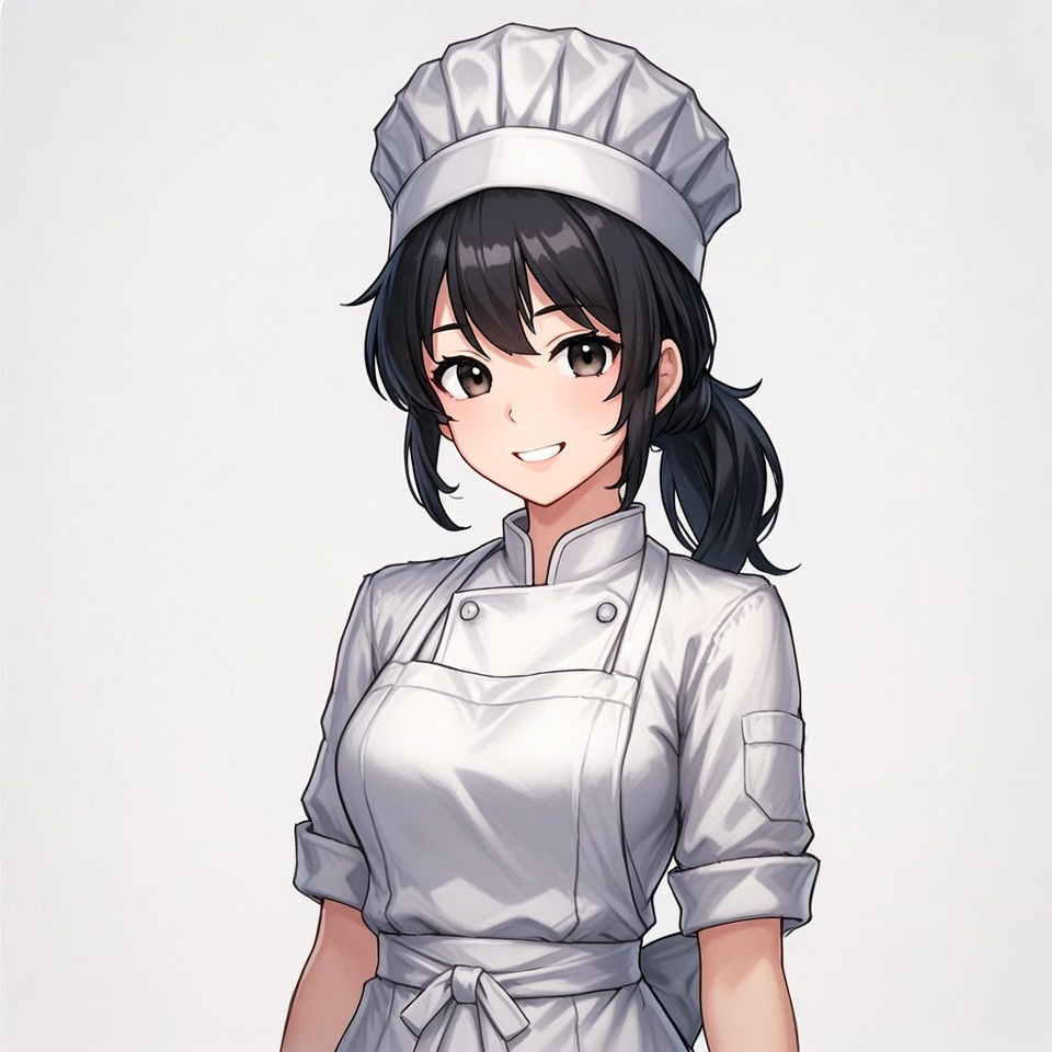 A smiling Asian anime girl with black hair in a ponytail wears a tall white chef's hat and matching chef uniform. She stands confidently with her hands behind her back against an isolated white background. The illustration features detailed shading and expressive eyes.