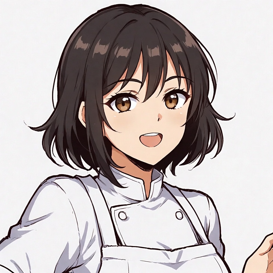 anime, brown eyes, brown hair, cartoon, chef, chef uniform, cute, female, girl, happy, illustration, isolated background, short hair, smiling, white chef jacket, anime girl